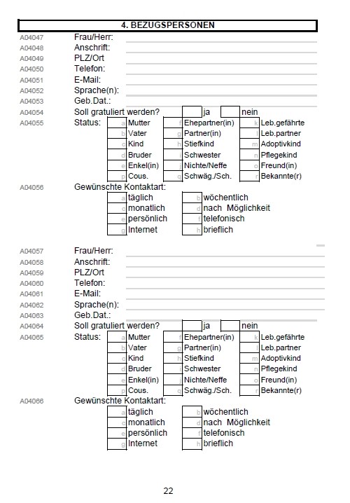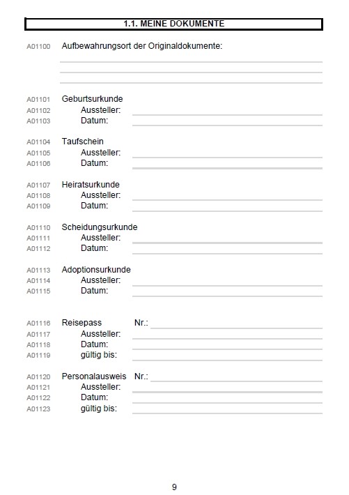 In welcher Genauigkeit die einzelnen Bereiche ausgefüllt werden, ist natürlich Ihnen überlassen: gesamt oder teilweise ausgefüllt oder als Schema für eine ganz eigene Liste genutzt ist es jedenfalls besser, als gar keine Informationen zu hinterlassen.