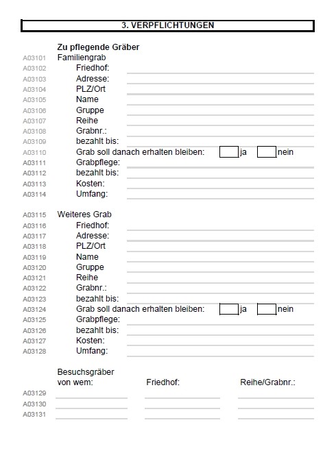 Auf diesen Seiten können Sie strukturiert aufschreiben, welche Garbstätten zu pflegen oder zu besuchen sind und welche Vereinbarungen hier bestehen.